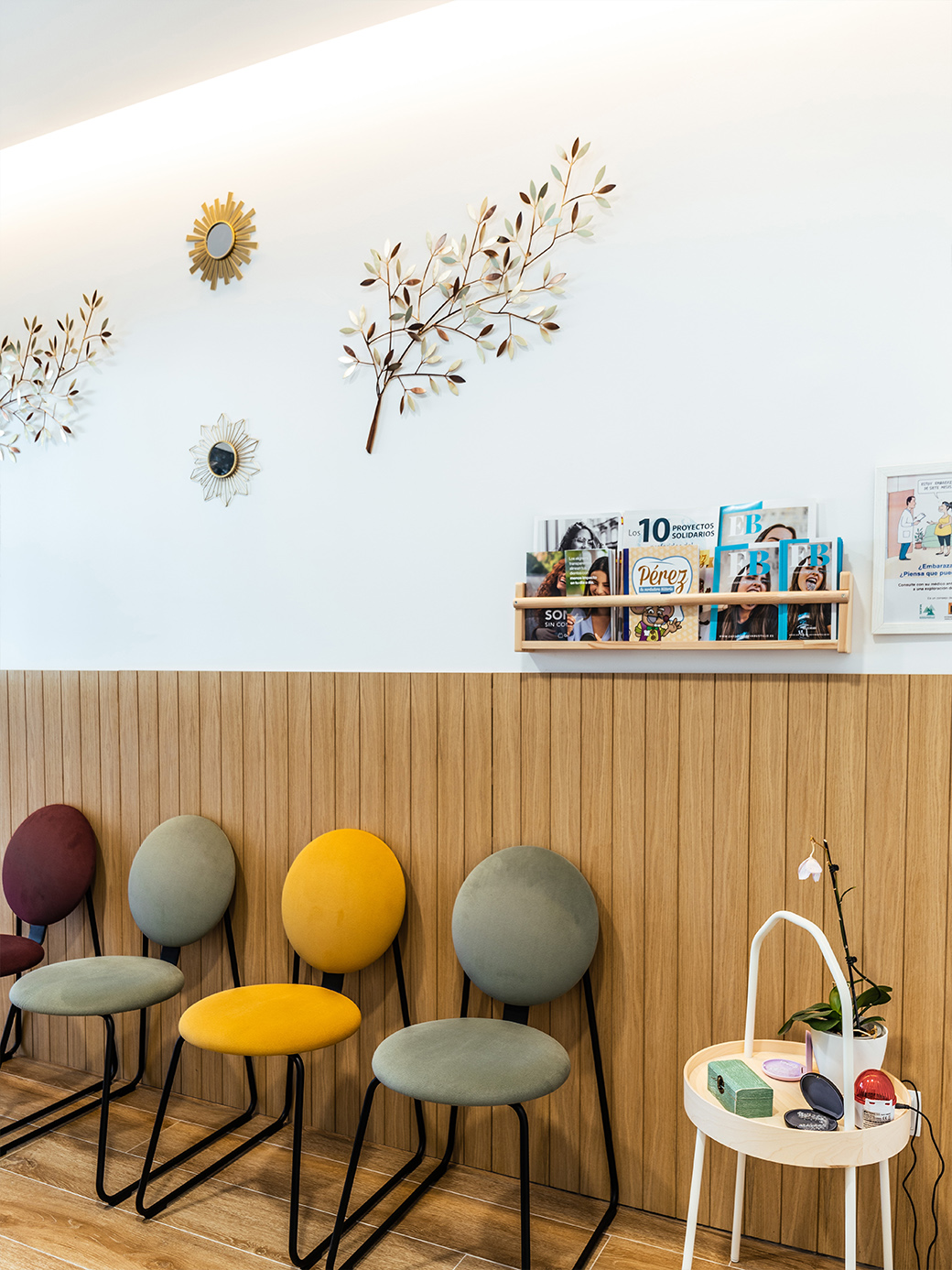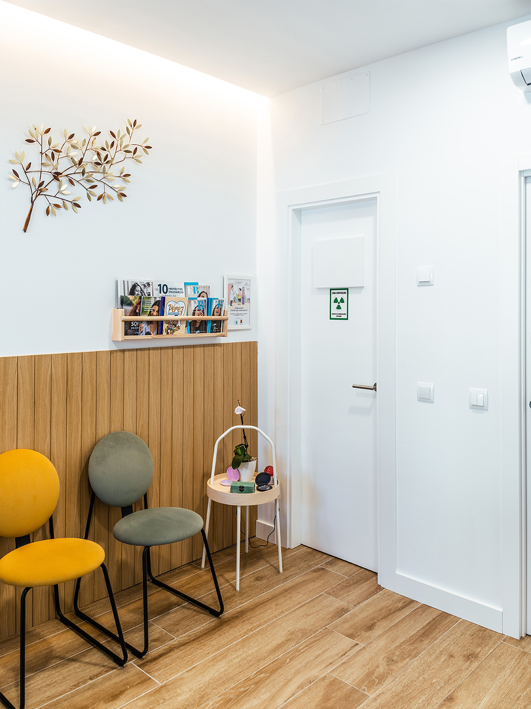 El diseño realizado por nuestros arquitectos incluye una amplia y luminosa sala de espera, decorada con tonos neutros y panelados de madera de roble que transmiten calidez y bienestar a los pacientes.
